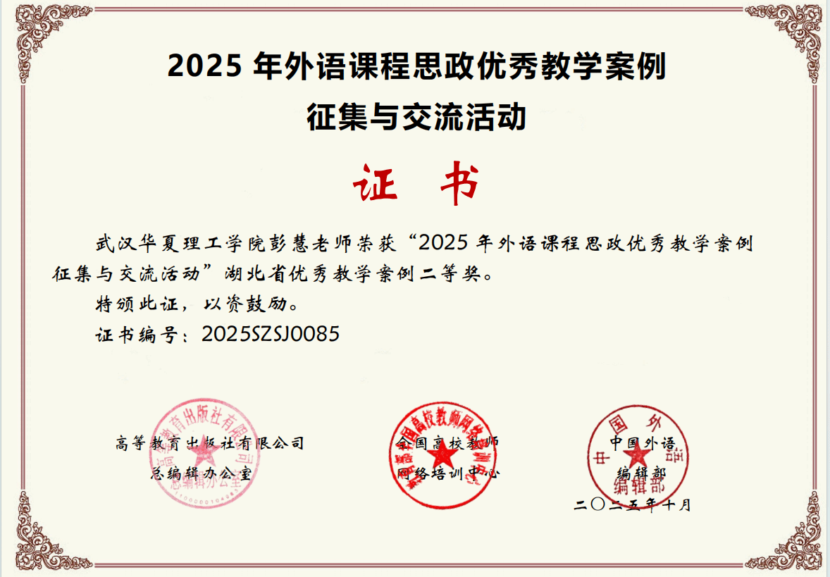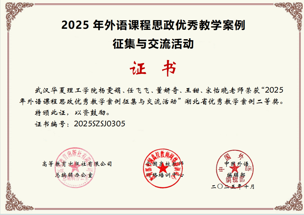 近日,在教育部高等学校大学外语教学指导委员会的指导下,高等教育出版社、全国高校教师网络培训中心与中国外语编辑部共同开展的2025年外语课程思政优秀教学案例征集与交流活动获奖名单正式揭晓,我校教师团队与个人凭借扎实的教学功底、创新的思政融入设计,在此次赛事中喜获殊荣——杨雯娟、任飞飞、董妍奇、王甜、宋怡晓老师组成的教学团队,以及彭慧老师个人提交的教学案例,均荣获“湖北省优秀教学案例二等奖”,充分彰显了我校在外语课程思政建设领域的显著成效。