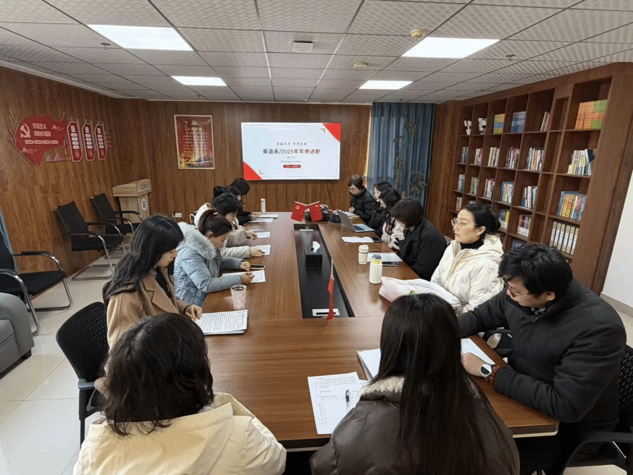 为全面回顾总结本年度工作成效,科学谋划未来发展,2025年12月26日上午,外国语学院英语系于综合楼1102室隆重召开2025年年终述职大会,全系教职工齐聚一堂,共话奋斗历程,共绘发展蓝图。本次会议由英语系主任杨雯娟副教授主持,英语系全体教师参与。