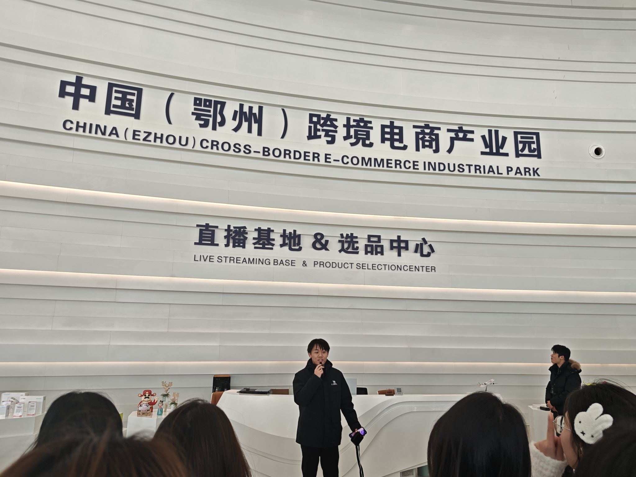 下午,学生们走进中国(鄂州)跨境电商产业园和亿玛科技开展实地参观学习。在产业园讲解员的引导下,学生们先后参观了产业园的产品展示区、直播实训区等核心区域,近距离接触跨境电商的产品选品、直播带货、运营推广等实际业务场景。