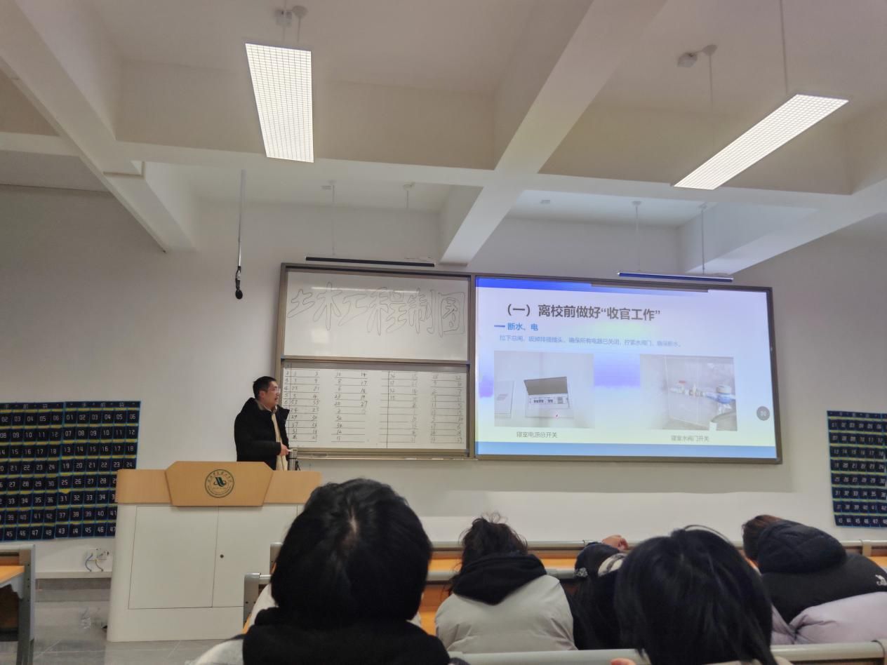 临近寒假,龚飞老师还对假期安全事项作出提示。他强调,同学们离校前务必做好收官工作,断水断电并拉下总闸,仔细检查门窗锁闭情况;同时详细讲解了定制公交的预约流程与时间安排,为同学们平安、便捷离校提供保障。