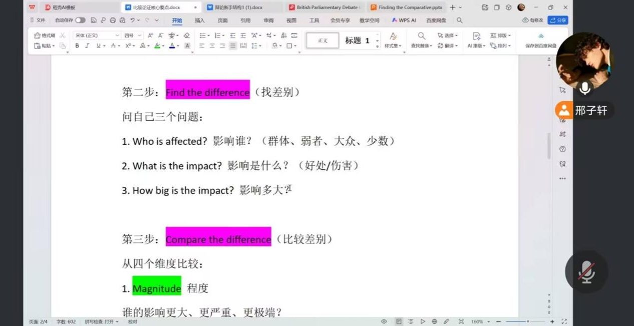在论证方法板块,主讲人系统阐释了Comparative论证方法的核心逻辑与战略价值。该方法强调通过结果比较来增强论点的立体感与说服力,其关键在于避免对对方观点的简单否定,转而构建“在承认对方部分合理性的基础上,论证己方立场更具相对优势”的论述框架。为使该方法更具可操作性,培训引入了从宏观影响层面到微观差异分析的多维度工具,包括从世界、国家、社会等维度进行影响对比,以及通过“受影响主体、影响性质、程度、范围、持续时间与可能性”六大问题切入的具体分析路径。