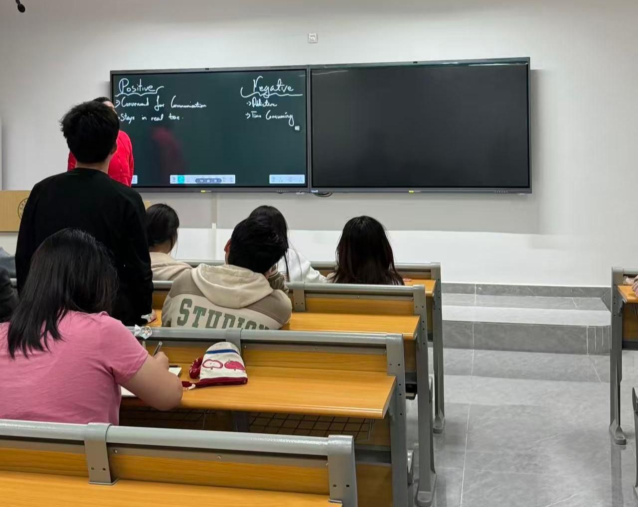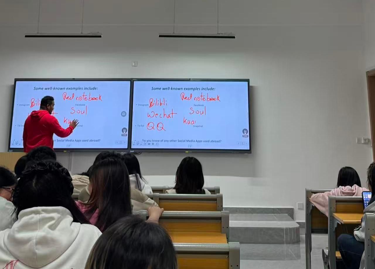 紧接着,外教用一系列贴近生活的互动问题引发了同学们的热烈讨论,大家结合自身使用经历,用流利的英语分享真实感受与思考。在自由交流环节,同学们围绕中国本土社交平台、社交媒体的合理使用方式、社交媒体的利弊等议题畅所欲言,“Does social media bring us closer or make us more isolated? Why?”这一思辨话题更是将现场氛围推向高潮,大家在观点的碰撞中辩证看待社交媒体的双面性,充分锻炼了英语口语表达与逻辑思辨能力。