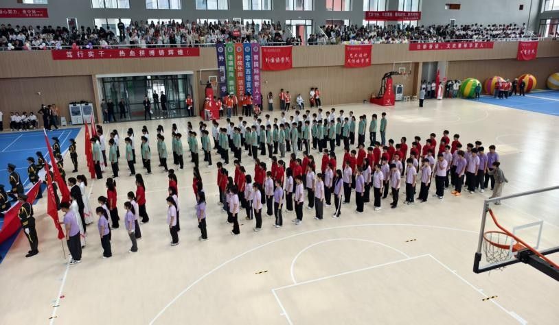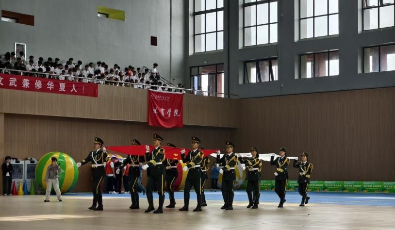 运动会开幕式在学校室内体育馆隆重举行。伴随着雄壮的《义勇军进行曲》,五星红旗在全体师生的注目下冉冉升起。随后,国旗护卫队迈着铿锵有力的步伐入场,他们身姿挺拔、目光坚定,以标准的动作展现着新时代大学生的精神风貌,也拉开了各学院方阵入场的序幕。