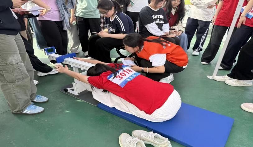 在室外篮球场的体测项目区,外国语学院的学子们也展现出了坚韧不拔的毅力。坐位体前屈测试点,同学们在垫子上尽力向前伸展,手臂的每一次延伸都是对自己的挑战;跳绳区里,选手们双脚交替跳跃,绳子在脚下划出一道道流畅的弧线,计数员们专注地记录着每一次跳跃,志愿者们则在一旁维持秩序、提供帮助。