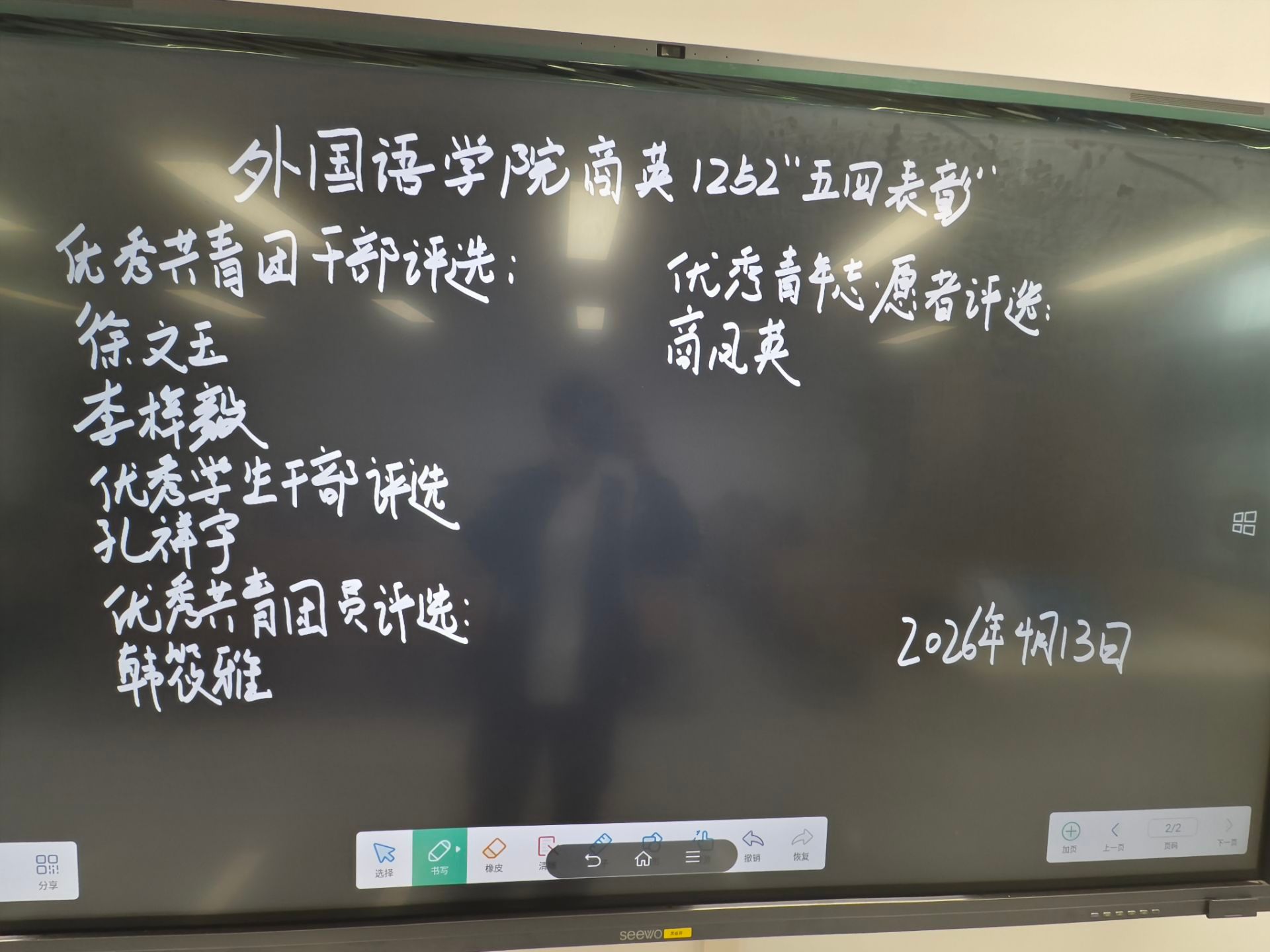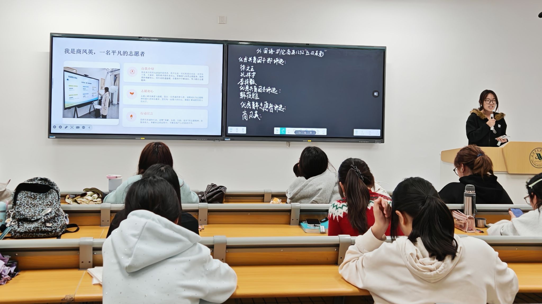 为弘扬五四精神,树立青春榜样,激发班级优秀青年奋进活力,4月13日,外国语学院商英1252班在A203教室以“民主评选+现场答辩”形式,开展“五四”评优活动,评选优秀共青团干部、优秀共青团员及优秀青年志愿者三类荣誉。本次活动由李梓毅主持。