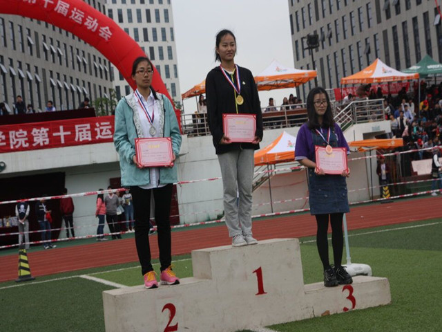 4月17日上午9点,我院校运动会女子100米跨栏项目中,外语系1142班尹雪娇同学赢得第二名的好成绩。