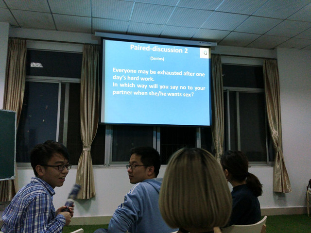 “你对在校大学生怀孕这个事情怎么看啊?”“我觉得大学生应该自尊自爱自律,做好自己,大学是学习的地方,提升自己的地方,应该以学习为主。”4月12日晚18点,外语系于语言文学楼313华夏译坊就“大学生怀孕”的话题进行讨论。