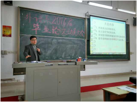 外语系于2015年12月25日中午一点在1-101教室召开了2016届学生毕业论文动员大会。外语系2012级全体学生及所有参与毕业论文指导的教师参加了大会。
