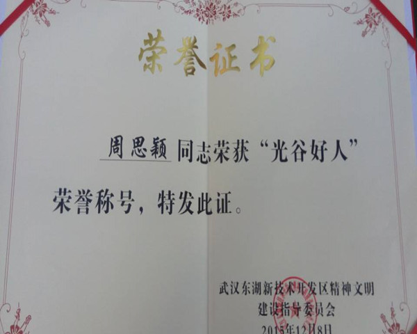 近日,我院外语系大二学生周思颖在2015年度武汉东湖新技术开发区光谷好人的评选活动中荣获“光谷好人”荣誉称号。