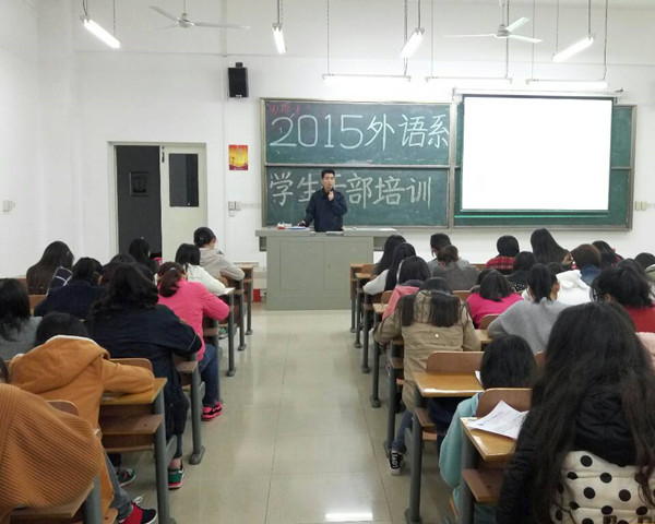 11月8日下午5点,外语系在教学楼1-101开展了以“如何做好班级建设”为主题的学生干部培训大会,有幸邀请到团委组织部部长、优秀学生干部优秀王泽宽为同学们分享学风建设,外语系团学联及各班班委均参加了此次培训会。