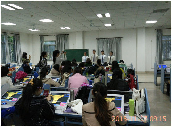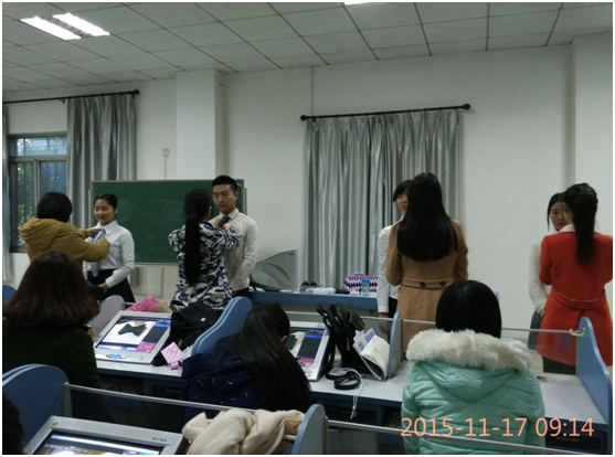 在前期的学习中,周敏老师利用PPT以及视频向同学们介绍了商务礼仪的主要内容、特点、原则等理论知识,全面讲解了仪表着装、举止交往、沟通礼仪、公务礼仪和电话礼仪等基本常识。为了取得更好的学习效果,今日周敏老师还举行“系领带PK赛”。比赛开始时同学们热情高涨,推选出各小组的“模特”及领带助手,在室外十度左右的初冬,模特们十分给力,纷纷脱下外套,身着衬衣走向讲台,领带系好之后,“模特”们更是绕教室走了一圈以作展示。配合着以前所字的标准站姿,走姿,现场气氛达到一个小高潮。这次的“系领带PK赛”增强同学们的动手能力,巩固所学知识。这样的竞赛,不仅增强了同学们的参与性与积极性,而且使大家加深了对商务礼仪的理解和认识。整个课堂洋溢着活跃的气氛,大家在高涨的学习氛围中掌握了领带的系法,效果十分突出,得到了所有同学的一致好评。一位受访女同学说到:“不仅可以自己系领带扮酷,还可以为未来的另一半指点。”