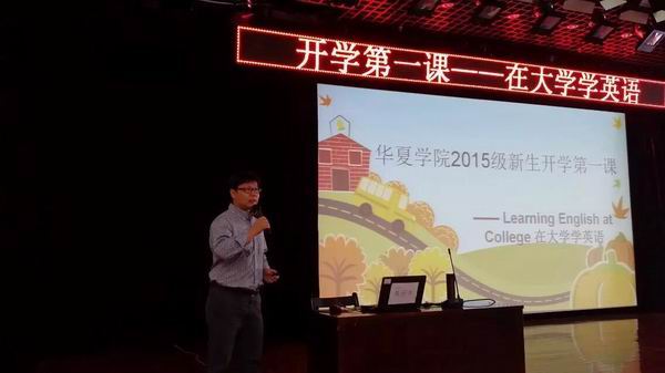 《大学英语》是每个大学生在大学的基础学习阶段的必修课。随着中国的国际地位日益提升,英语已经不仅仅是局限在校园里的一门课程,它更多的成为了一种交流的工具。不论是英语专业,还是其他专业,今后的职业发展都和英语息息相关。外语系大学英语第一教研室结合新生的专业特点,总结往届学生在英语学习上所遇到的困惑,为2015级刚入学的大学生们量身打造了“开学第一课——在大学学英语”。刘沛主任、王丽丽老师分别从学习内容、学习方法等方面,全面的向学生讲解了《大学英语》这门课程的学习要求以及课程设置;同时还向新生们介绍了“华夏学院英语文化节”,英语“第二课堂”等特色活动,展示了华夏学院良好的英语学习氛围。