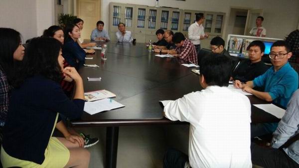 2015年10月15日下午4:00在大学生事务活动中心由外语系刘沛主任带队的大英教二的全体英语老师和由学生处胡水兵处长带队的14级全体辅导员老师齐聚一堂进行一次启动英语四级帮帮团的圆桌会议。