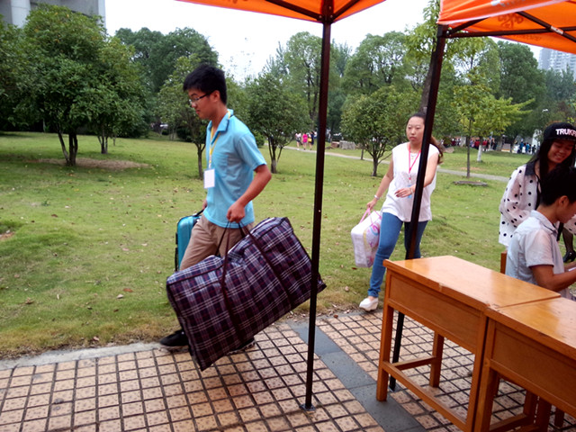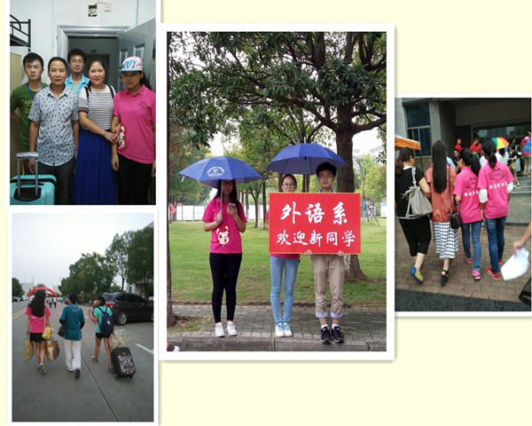 在校园的随处一角,都可见身着统一服装的外语系志愿者穿带领新生穿梭于校园的各个角落,他们热情的为新同学答疑,帮新同学拎行李包裹。
