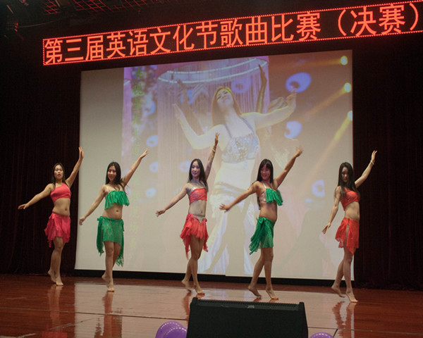一场热辣的肚皮舞和动感的音乐拉开了决赛的序幕,由中国第一位在人民大会堂跳肚皮舞的舞者田维维的五位学生给全场带来了精彩的舞蹈,为第三届英语文化节助威助阵。