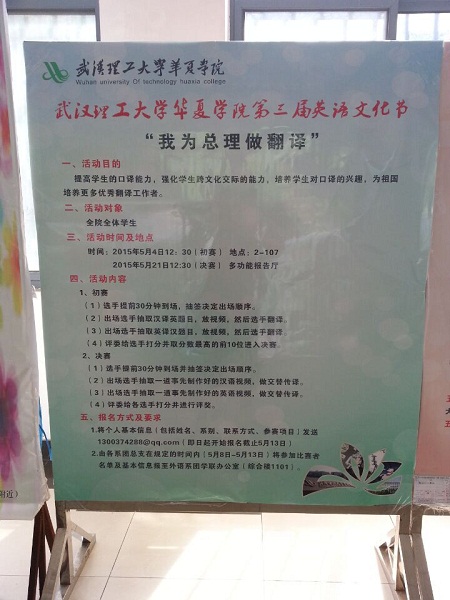 这次“英语文化节”将通过读书小报展、英语歌曲大赛、BP英文辩论、我为总理做翻译、你是我的Morning Call、“影音风采”电影配音大赛,一系列板块的活动来丰富学生的课余生活,在全校学生中兴起学习外语知识、了解世界文化的热潮,展示大学生外语风采,培养学校浓厚的英语学习气氛,营造良好的校园文化氛围。预祝英语文化节圆满成功!