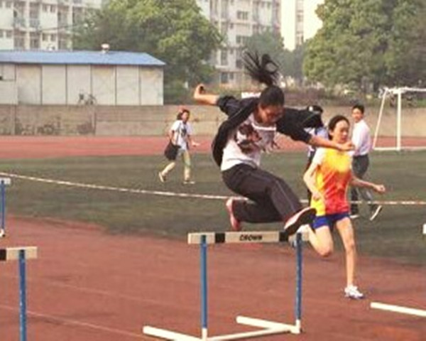 在女子100米跨栏赛中,外语系尹雪娇同学荣获第二名的好成绩。她起身一跃,跃出外语系女子风采。