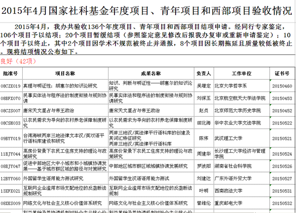 2015年5月6日, 全国哲学社会科学规划办公室发布了国家社科基金年度项目、青年项目和西部项目成果鉴定等级公告,我院外语系陈伟教授主持的国家社科基金项目《台湾海峡两岸三地法律文本汉/英双语平行语料库建设和研究》(09BYY019),顺利结题,鉴定结果为良好,结题证书编号为20150521。该项目最终成果为专著《两岸三地汉/英法律平行语料库的创建及其词汇特征研究》及软件《两岸三地汉/英法律文本平行语料库》。