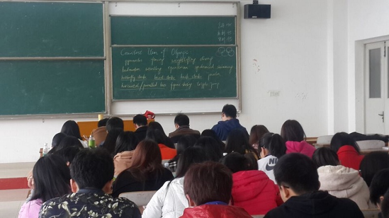 在进入课程主题前,我在黑板上提前列举了常见且具有代表性的奥运会比赛项目。接下来的课堂互动环节,学生们你比我猜,一旁的我不断用英语解释那些复杂动作,“声形并茂”地展示出每种运动的特色,势必让他们能最快的做出反映,得到答案。大家都是蛮拼的。