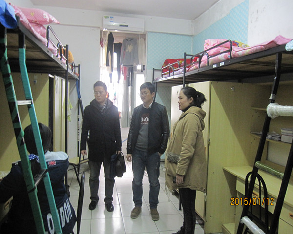 2015年1月12日中午,外语系学工办主任孙华及两位辅导员付寿康和王英老师走进外语系学生寝室,对各寝室进行了本学期期末安全检查,以确保学生寝室安全,做好冬季防范工作。