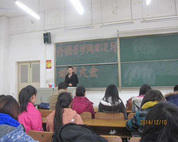 为加强外语系学风建设,12月10日中午12点10分,在教学楼1-101举行了学风建设大会,参加本次大会的有外语系学工办马勇主任,外语系辅导员付寿康、王英老师以及团学联全体成员。