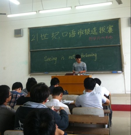 全国大学生演讲比赛华夏学院校园争霸赛已经拉开了序幕,在全院不分专业不分年级之间开展优秀英语演讲者的选拔。为了积极响应这一活动,14级大学英语教研室积极宣传和组织选拔。大一新生虽然刚刚正式上课只有两周的时间,但是他们非常珍惜这个难得的全国性的口语比赛的机会,个个摩拳擦掌要在口语校园选拔赛上一争高下,大有初生牛犊不怕虎的勇气。