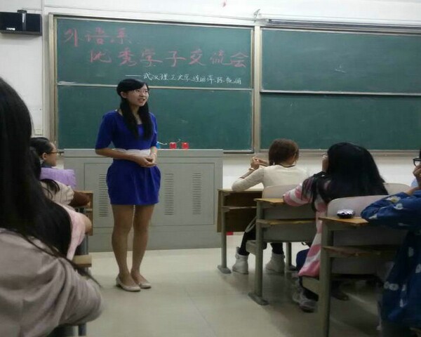 2014年10月10日晚外语系在3-208教室我们请到了武汉理工大学外国语学院研究生连丽萍、陈凯丽做经验交流。