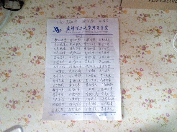 经过一个小时的写作,以班级为单位交上感恩信。在100多封真诚的感恩信中,外语1143班的潘宏参同学的感恩信以其形式新颖、情感真挚、字迹工整的四字诗体《致双亲》赢得了付老师的表扬,付老师特意请班上朗读好的同学们一起朗读这份感恩信,新生们听完后,反应热烈,被其真挚的情感打动,感触深刻。
