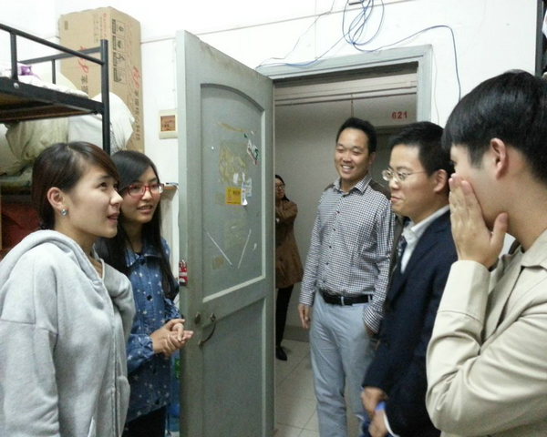 师生代表一行人首先来到3A622对10月9日迎新晚会中负伤仍坚持演出的学生——钟明蕊表示关心和赞扬,并叮嘱她好好休养,愿她早日康复。 接下来针对秋季细菌滋生、流感多发等情况,师生一行人在我系各年级男女寝室抽查走访。系领导对寝室卫生优秀的做出表扬,也对相对较差的提出改进要求,特别提醒同学们注意卫生保洁和学习态度的和谐性。在最后马主任建议在计划开展的寝室文化设计大赛中对文化氛围浓厚的寝室做出特别表扬。整个过程查寝人员认真负责、礼貌的态度得到同学们的欢迎。