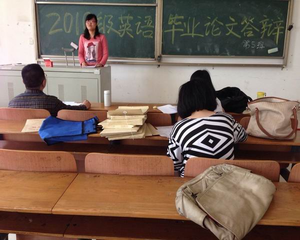外语系2014届毕业生论文答辩将于2014年5月23日下午进行。外语系本届毕业生共106人,分为八组,进行答辩。答辩严格遵循下列程序进行:每个学生3-5分钟的论文介绍;答辩组老师提问,学生答辩;答辩后,必要的论文修改、完善工作;答辩老师综合评定;公布论文最终成绩。对于第一次答辩未通过的学生,待全组答辩完毕后给予第二次答辩机会。外语系按照惯例,严把质量关,采取“三结合”的方法把住质量关:论文指导老师、答辩组长、系主任三方联合,坚守质量关,优秀毕业生论文宁缺毋滥,质量不达标的论文决不降低标准,将就通过。因为严把质量关,本届学生没有因论文质量不达标准,被延期答辩的情况。