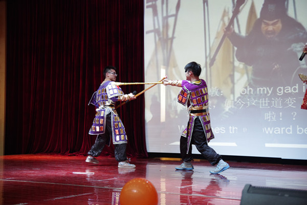 在激情四射的歌曲串烧、影视配音表演之后,工商1132班7位表演者将喜剧元素融入三国剧情之中,演员逼真的表演、滑稽的英文翻译将英语的趣味体现得淋漓尽致。