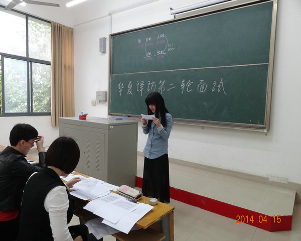 2014年4月15日中午12:10,华夏译坊最后一轮面试在教学楼如期举行。经过第一轮180人的海选,最终来自全院八个系的40位选手成功晋级第二轮面试。外语系教研室主任白燕琴老师、以及杜英老师、刘潇老师、唐慧老师、朱姗姗老师担任面试官。