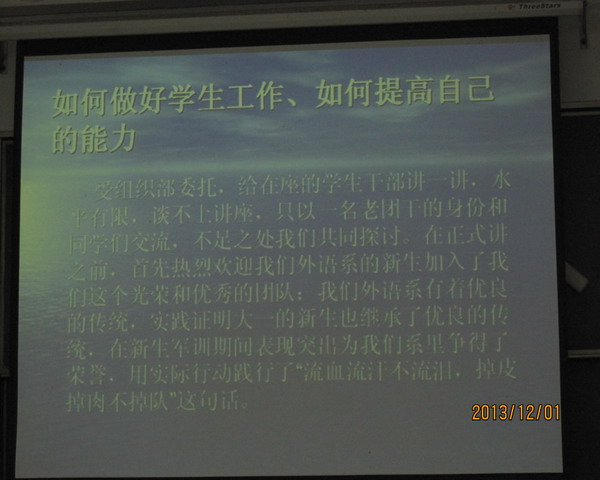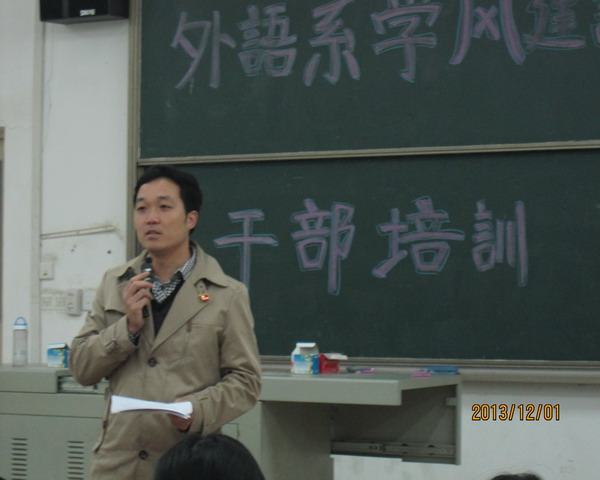 2013年12月1日下午4:30,由外语系学工办主任马勇老师主持的外语系学风建设干部培训大会在2-101召开。参加本次会议的有外语系团学联各部门干部以及各班班长、团支书。本次会议围绕“如何做好学生工作以及如何提高自己的能力”展开。