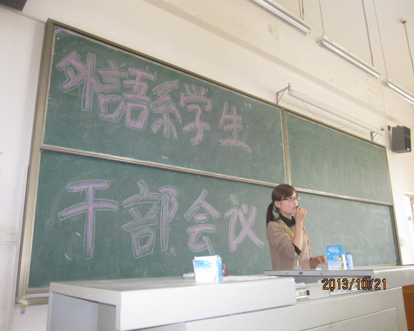 2013年10月21日12;30,武汉理工大学华夏学院外语系在1-101室召开了外语系学生干部全体大会。参加此次会议的有外语系团总支书记郭杰老师,副书记席春燕,外语系团学联主席黄瑶,副主席但蕾,各部门部长、干事以及各班班长、团支书。