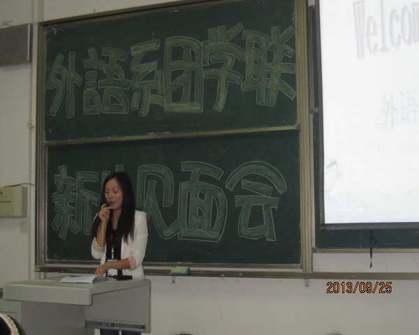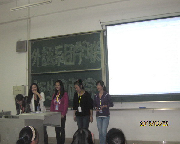 2013年9月25日下午七时,外语系团学联在第三教学楼110教室召开了新生见面大会。这是自外语系新生军训结束后首次与团学联的学长、学姐们见面。为了给这些新生一个好印象,初升大二的团学联干部们准备了很长时间。每一个部门都制作了精美的幻灯片,希望初进华夏的学子们更加了解这所可爱的大学。
