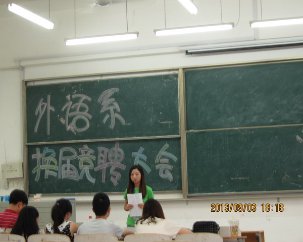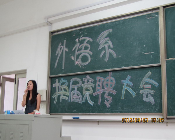 开学伊始,万象更新!外语系领导为保持系内活力、鼓足干劲,在9月3日召开了外语系团学联换届竞聘大会。参加本次大会的有:外语系团总支书记郭杰老师,11级团学联成员以及12级团学联成员。