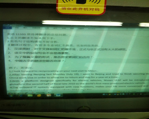 2013年9月10日下午三点,外语系2010级在武汉传神翻译公司实习的全体同学在1-105教室第一次听取了本次实习专家曹老师的讲评。传神翻译公司的讲评专家通过远程方式,凭借自己渊博的知识,丰富的实战经验,针对上周实习内容进行讲评,令实习同学受益匪浅。