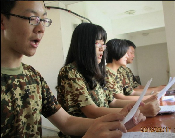 虽然军训播音员没有和其他同学一样全天候军训,但是他们的工作也很辛苦。每天早上,军播们都要领取来自各个系近百篇稿件,拿到一篇稿子后,并不是随便看看就能往外读;每一篇稿子,他们都要在广播台各个学长学姐的监督下练习数十遍,并用笔在稿件上标明读音、节奏、情感等,只为将最好的军训稿传递给大家。一天下来,他们的嗓子往往都已沙哑。