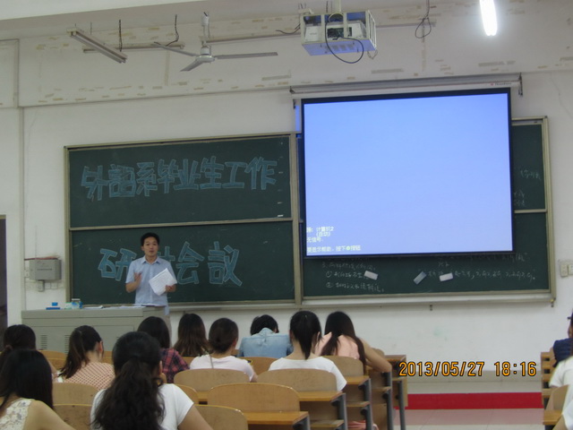 2013年5月27日下午6:00外语系毕业生工作研讨会议由外语系主任马勇在教学楼2教101主持举行。