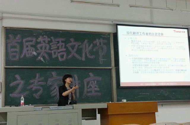 2013年5月15日星期三晚6:50,传神翻译公司专家闫栗丽在3教301主要给外语系学生做了一次讲座,外语系学工办主任马勇主持,此次讲座也是外语系主办的英语文化节系列活动之一。专家闫栗丽主要讲了翻译的重要性、当代翻译工作者的历史使命以及翻译这一行面临的问题与挑战等话题。