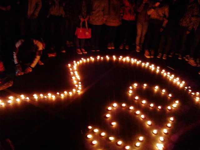 4月22日晚7:35在一食堂门口篮球场上,院青协同学召集一些华夏学子,在地上用蜡烛摆出了用爱心包围的“4.20 ”的形状。在感人的音乐之中,华夏学子们默默为地震受灾的雅安同胞们哀悼,用心祈福。