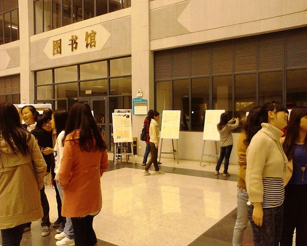 活动开展:4月22日活动正式开始。陆陆续续进出图书馆的华夏师生在大厅中驻足欣赏读书小报并且为自己喜欢的作品投票。有些同学还与小报创作者进行了读书交流。