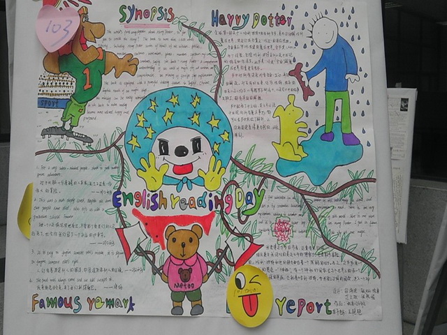 很多同学今天也许还沉浸在英语文化节的精彩表演之中,表演只是那短暂的几分钟,而真正能深入人心的是读书小报,在2013年4月25日星期四早上9:30,还有同学在综合楼大厅欣赏着这些小报,可见这些小报在大家心中地位非凡。