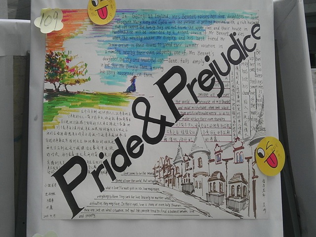 在这些小报之中,像《小王子》《傲慢与偏见》《简爱》等作品的数量多一些,可见这些作品比较受欢迎。每部所选作品都要求要有故事梗概、经典语句、读书心得等内容,至于绘画、构思等都是在考验学生想象力和审美观。有同学低声评论到:“这两张小报十分出彩,一份《Pride and Prejudice》和一份《Harry Potter》,这两张小报无论从绘图、背景颜色,还是从字体、构思方面都十分精美,尤其是《Harry potter》这幅作品的漫画十分新颖,很有美感,带有一种积极向上的韵味,任何人看到这张小报也都会感同身受”。其实想要出彩,最重要的还是创新。