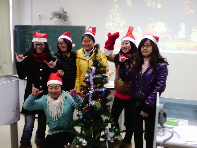 看着头戴圣诞帽,脚着圣诞鞋的周敏老师抱着她从家里搬来的圣诞树,原来满载冷空气的教室瞬间点燃,一如既往的听力课此时也变身为狂欢天堂。
