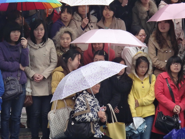 在拍照之前,外语系学工办主任马勇冒着雨指导学生们按照一定的顺序站好,同学们看着这一场景,也感动的收掉了手中的雨伞,共同等待老师们的到来。在老师们到来那一刻,同学们欢呼着,她们要用最积极向上的态度感谢这些曾经教过她们的辛勤园丁们。