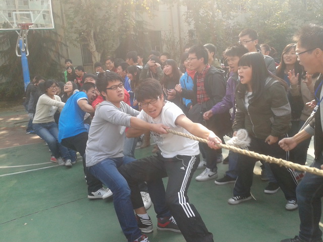 宣誓之后,激烈的拔河比赛在主持人讲解完比赛规则后正式开始。参加比赛的都是由各个系推选出来的大力士,而其他同学也积极地参与到了啦啦队中为他们系的参赛选手们加油打气。