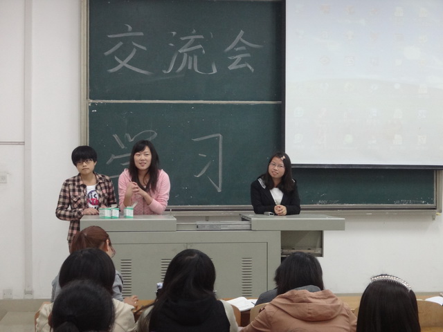 2012年10月25日晚7:00,外语系2012级各班举行学习经验交流会。2012级新生以及新生班主任都参加了此次学习经验交流会。此外,她们还邀请了优秀的学长、学姐为她们介绍大学学习经验。