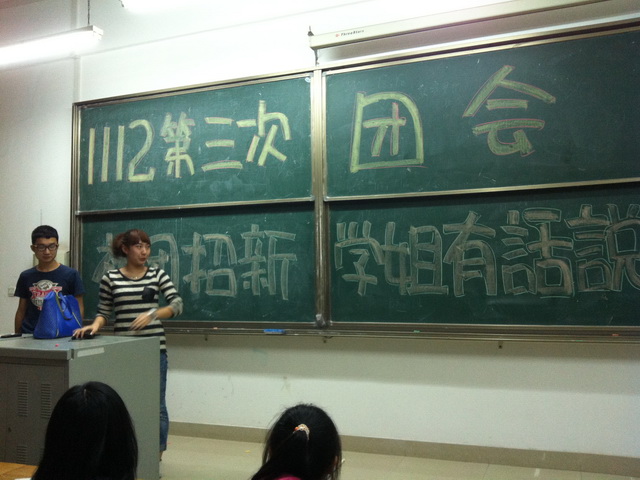 2012年10月14日晚6点半,商务英语1112团支部在2教403举办了以“社团招新,学长学姐有话说”的主题团会,大家就2012级新生在面对五花八门的社团招新活动时所表现出来的困惑发表了个人见解。