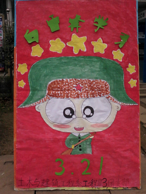 此次活动以班级为单位,要求各班充分发挥团之宗旨,结合雷锋精神,让团之活动更具体、丰满。活动热烈开展着,一食堂门口的篮球场成为各办活动的大本营。各式各样的展板,一排排帐篷,彩球等成为一道独特的风景线,伴随着各班同学为宣传而喊的各种口号,全院沉浸在别样团风的氛围中。不仅如此,各个班比拼创意,学习雷锋好榜样,DIY雷锋形象,佩戴雷锋头像胸章……